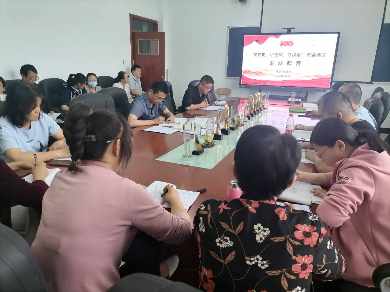 支部书记范玉敏在讲话中要求全体教师在强化“四史”学习教育的同时开展师德、优秀典型、先进事迹的学习,工作中要自查自省,立行立改,践行师德规范,树立良好师德师风形象。