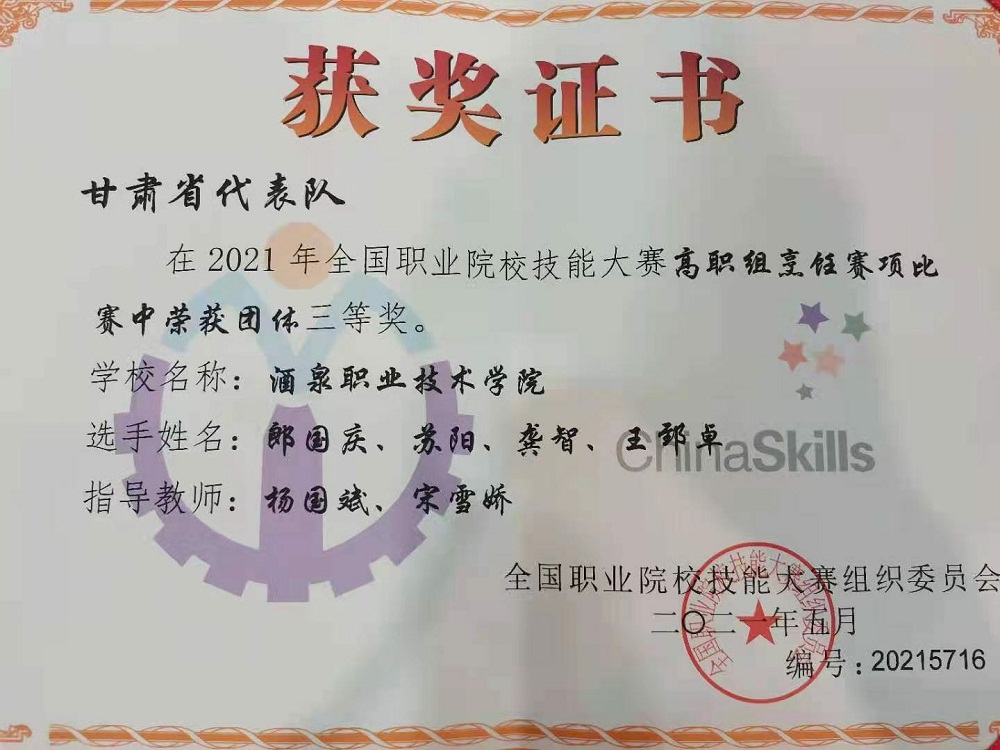 2021年6月27日下午,2021年全国职业院校技能大赛烹饪(高职组)赛项在辽宁现代服务职业技术学院举行,来自全国各省的27支代表队,共计108名选手在这里同场竞技。最终要决出一等奖3个,二等奖5个,三等奖8个。酒泉职业技术学院旅游与烹饪学院的参赛队,代表甘肃省出征国赛。客场作战,强手如林,赛场提供的设备不熟悉,甚至是第一次接触……指导老师杨国斌、宋雪娇和参赛队员郎国庆、苏阳、龚智、王郅卓克服了种种困难,发扬着胡杨精神,不屈不挠,坚韧不拔,努力向上的精神,赛前反复强调注意事项,做好各种突发事件的应急预案,奋力拼搏,最终我院的杨国斌、宋雪娇指导的团队制作的“锦绣祁连宴”取得了三等奖的好成绩。