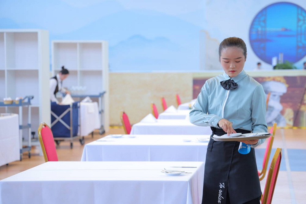 6月21日至23日,2021年全国职业院校技能大赛(高职组)餐厅服务赛项在青岛酒店管理职业技术学院举行。杨蕊肇、胡文婷两位指导教师和曾玉燕、张凌霄两位选手组成的参赛团队参加了比赛。2021年全国职业院校技能大赛(高职组)餐厅服务赛项,较往年发生了很大变化,中餐服务包括主题宴会设计和宴会服务两个模块;西餐服务包括鸡尾酒调制与服务及休闲餐厅服务两个模块,竞赛时间均为2小时。比赛要求参赛选手在掌握扎实的服务基本功的同时,更加关注客人的消费需求,预见客人的服务诉求,为客人提供有针对性的个性化、舒适度服务。