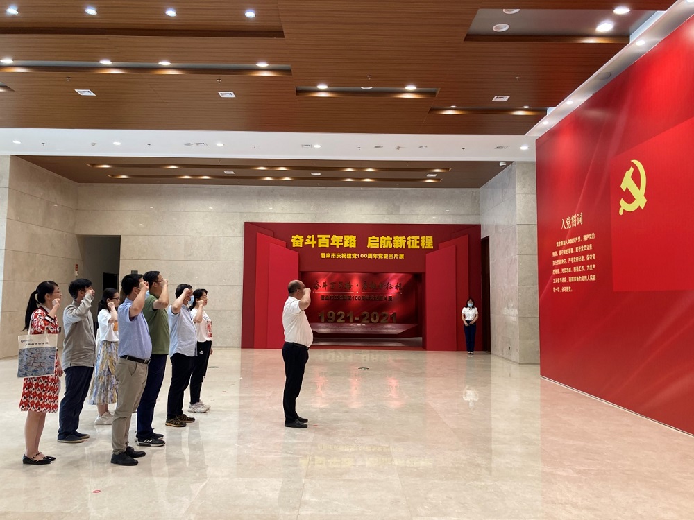 该作品展由酒泉市宣传部举办,展览共征集到60多位作者的760余幅作品。经过初评、复评、终评,最终挑选了100组照片,以新旧对比的形式,展现酒泉发展,献礼党的百年华诞。展览的作品跨越历史时间最长61年,覆盖酒泉市7个县(市、区)政治、农业、工业、民生、城市建设、教育、文化、卫生、生态等多个方面的维度场景,用有温度的影像讲述了建党百年来,酒泉市综合实力稳步提升,经济发展成果丰硕,城乡面貌焕然一新,文化事业日新月异,人民生活富裕幸福的各个精彩瞬间。反映了几代酒泉人我将无我、不负人民的真挚情怀,风雨同舟、守望相助的精神力量,创新奉献、自立自强的感人故事。参观完毕后党支部书记杨洁同志带领全体党员重温入党誓词。