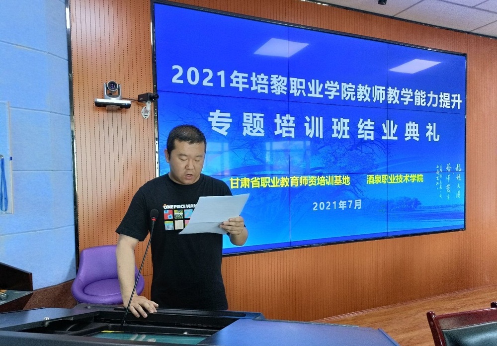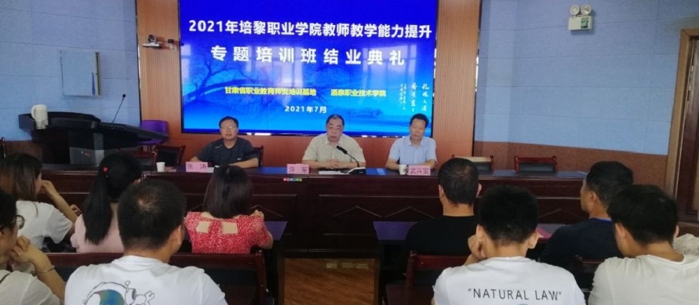 2021年7月31日,“培黎职业学院教师教学能力提升专项培训班”在甘肃省职业教育师资培训基地(酒泉职业技术学院)圆满结业,酒泉职业技术学院副校长许军教授、酒泉职业技术学院生物工程学院院长武兴宝、副院长张涛、培训班班主任参加了结业典礼。