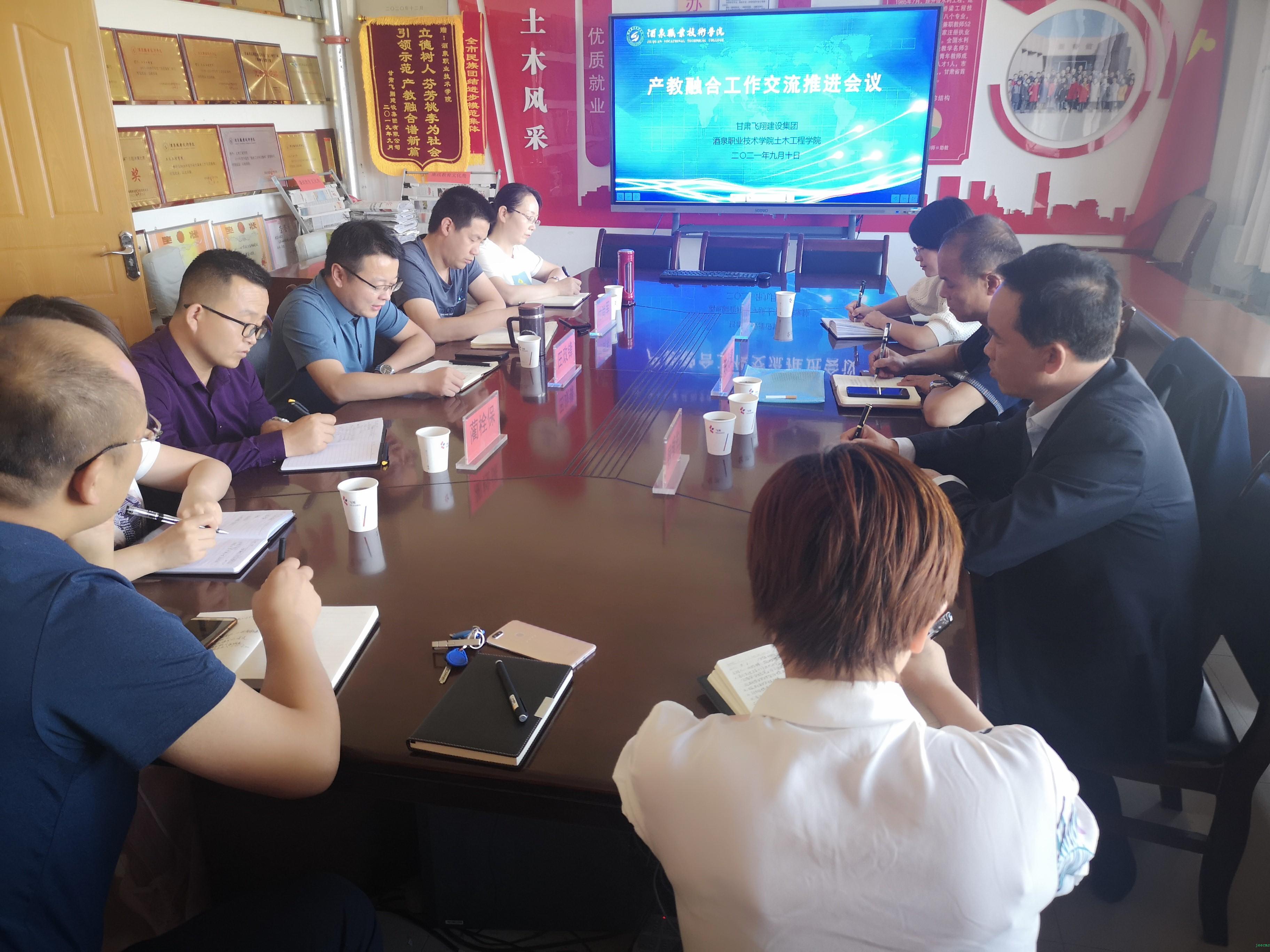 2021年9月10日,土木工程学院邀请国家产教融合型企业---甘肃飞翔建设集团相关领导来我院共同开展产教融合工作推进交流会议,会议由土木工程学院党支部书记、院长田政锋同志主持,学院领导班子、相关教师参加会议。甘肃飞翔建设集团办公室主任陈代表、飞翔集团酒泉恒翔建设工程质量检测中心有限公司总经理魏锋生、飞翔集团弘翔培训中心主任毛金荣等领导受邀参会,会议在行知楼511会议室召开。