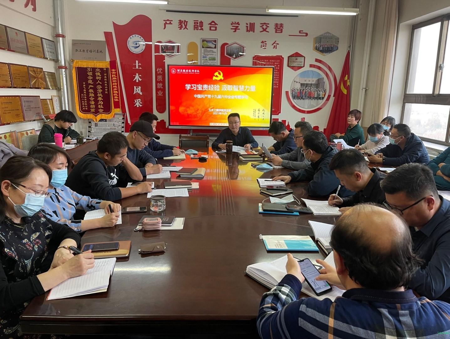 院系动态 > 正文11月16日下午,土木工程学院召开学习党的十九届六中全会精神专题会议。与会人员集体学习了《中国共产党第十九届中央委员会第六次全体会议公报》和习近平总书记《关于〈中共中央关于党的百年奋斗重大成就和历史经验的决议〉的说明》及相关评论文章,并对学院学习宣传贯彻十九届六中全会精神做了安排部署。党支部书记、院长田政锋同志主持会议,全体教职工参加会议。
