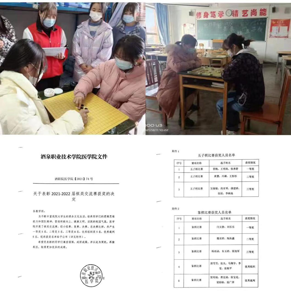 通过初赛、复赛、决赛、总决赛,男女生中国象棋五子棋总场数70场比赛的角逐,2021级护理5班贾梅、2021级护理本科班王明珠等18名同学获得各组别一二三等奖。