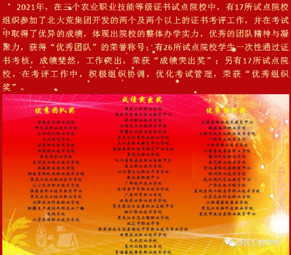 2021年由生物工程学院申报的教育部第四批“1+X”职业技能等级“家庭农场粮食生产经营”及“农业经济组织经营管理”证书考评鉴定工作圆满结束。因在考试中取得了优异的成绩,体现出院校的整体办学实力,优秀的团队精神与凝聚力,学校被社会培训评价组织北大荒集团给予“优秀团队”的荣誉称号。