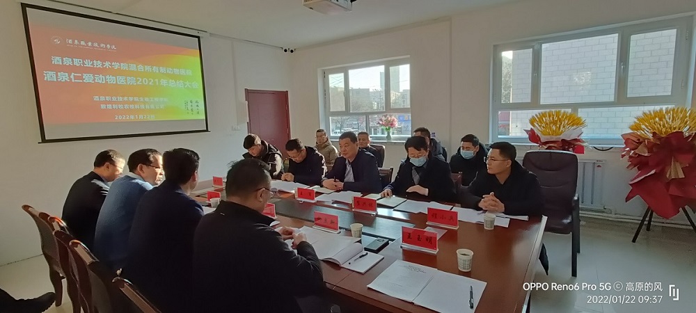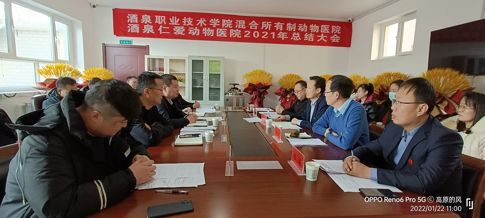 院系动态 > 正文为积极推动党建工作和校企合作深度融合,引领产教融合向实质性发展,搭建干事创业的良好平台。2022年1月22日上午酒泉职业技术学院混合所有制动物医院—酒泉仁爱动物医院2021年度工作总结大会在酒泉仁爱动物医院会议室召开。本次会议邀请了学校创新创业学院院长倪兴军、教务处副处长王军、校产管理处副处长崔兴林、后勤管理处副处长程小兵出席。敦煌市利牧农牧科技有限公司总经理赵文昌、酒泉仁爱动物医院院长席中全、生物工程学院领导班子全体成员及畜牧兽医系全体教师及党员20余人参加了会议。会议由生物工程学院副院长柳立新主持。