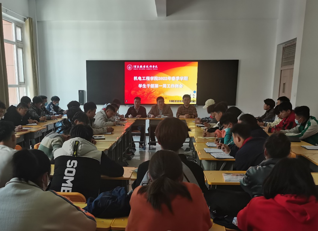 新学期、新气象,2月28日中午机电工程学院在格物楼召开了2022年春季学期第一周学生干部工作例会,学院副院长赵国鑫、学生工作办公室全体人员、全体学生干部参加。