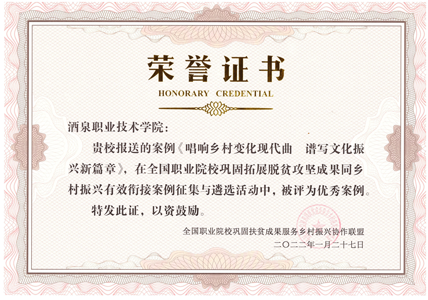 1月27日,全国职业院校巩固拓展脱贫攻坚成果同乡村振兴有效衔接优秀案例遴选结果公布,经专家对全国报送的113个案例进行遴选,共评选出40个优秀案例。我校报送的案例《唱响乡村变化现代曲,谱写文化振兴新篇章》被“全国职业院校巩固扶贫成果服务乡村振兴协作联盟”评为优秀案例。