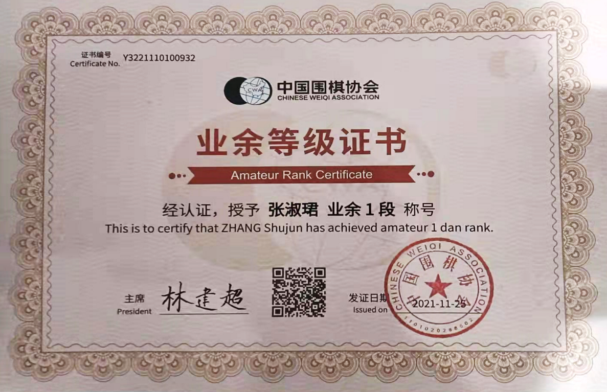 2019年9月2日,“葛道”围棋师资特色班开班,围棋专业教师进课堂为学生进行授课,学生通过弈客少儿围棋平台、校内培训进行“线上平台+线下培训”相结合进行学习。张淑珺成为了围棋师资班的一员,在老师和同学们的眼中,她是一位积极向上、勤奋好学、严格要求自己的阳关女孩。在校学习学习期间她考取了围棋段位证书业余一段、围棋教师资格证、保育员证、全国计算机一级证书、普通话二乙证书和英语B级证书,荣获围棋级位赛第二名成绩。