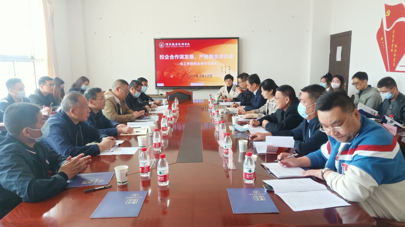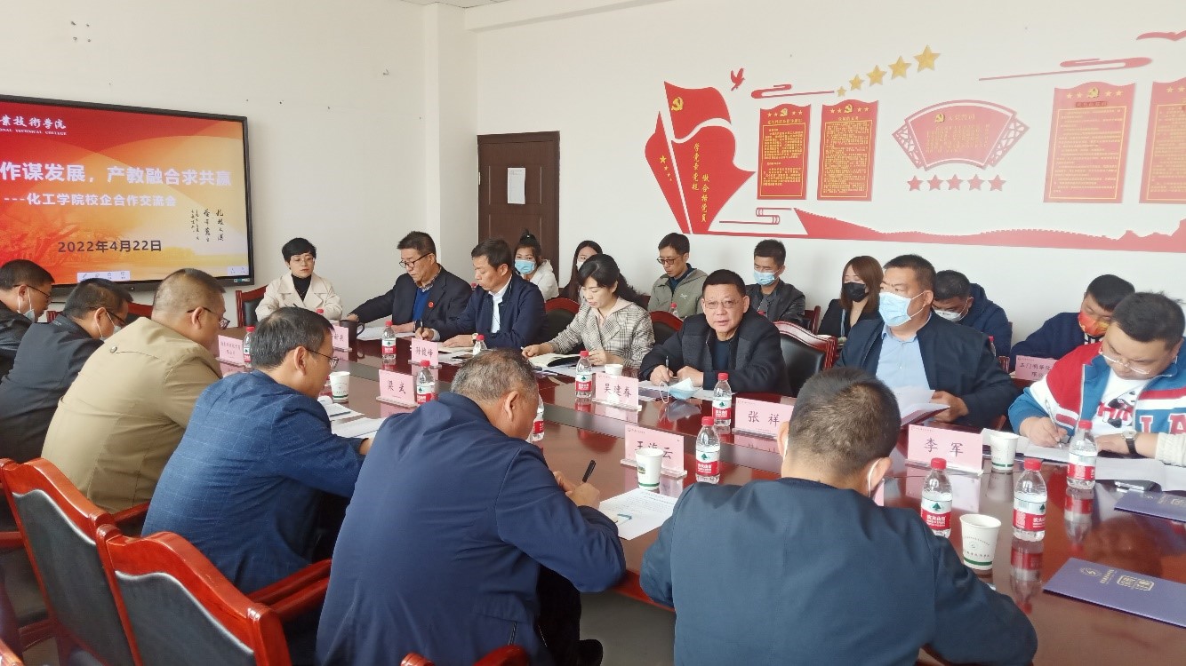 院系动态 > 正文为了深入服务地方经济,助力酒泉化工产业快速发展,进一步加强校企合作互通和产教融合,全力推动学校双高建设和职业技术本科创建,我院于2022年4月22日在逸夫楼二楼会议室召开“校企合作谋发展,产教融合求共赢”为主题的校企合作交流会,会议由化工学院党支部书记、院长许新兵主持。