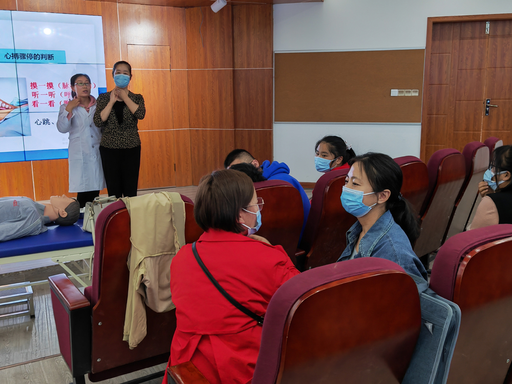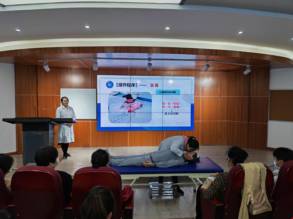 护理系主任孙慧峰利用人体模型对心肺复苏术的各环节,包括判断是否丧失意识、有无自主呼吸、有无脉搏及如何进行胸外心脏按压、清理口腔异物、开放气道、人工呼吸等操作流程和技术要领进行了逐一讲解和同步演示。