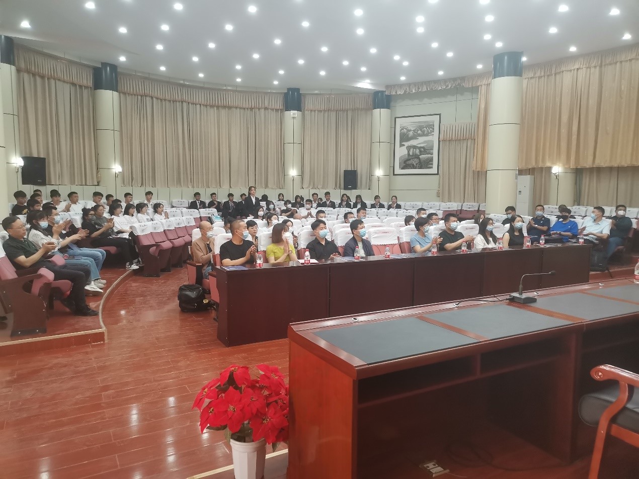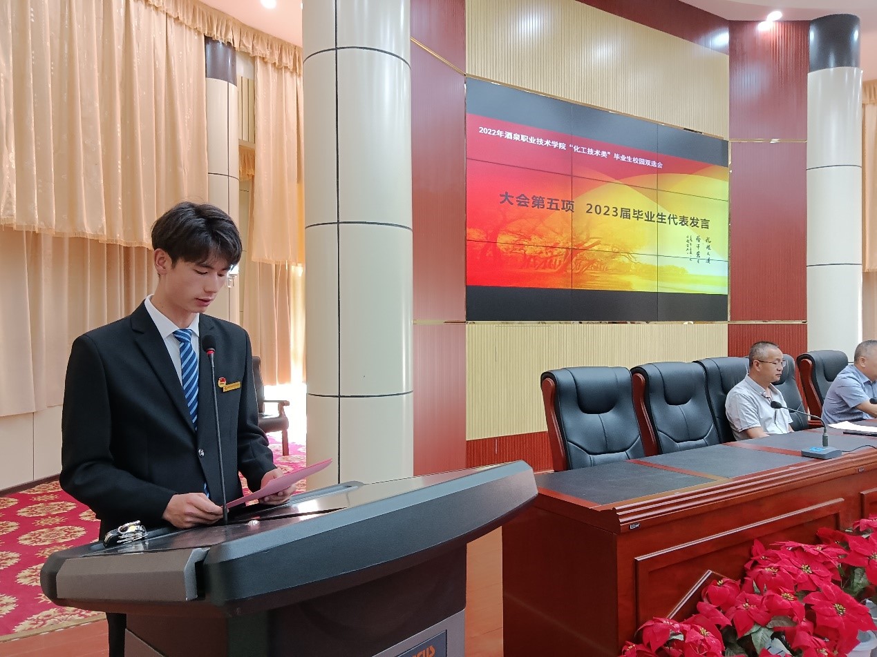8:30分双选会开幕式在逸夫报告厅举行,参加线下双选会的26家企业参加了开幕式。首先,王立智副校长发表了热情洋溢的致辞,随后,化工学院党支部书记、院长许新兵介绍了化工学院和本次双选会的基本情况。随后企业代表新疆蓝山屯河聚酯有限公司人力资源部部长宋斌女士和2023届毕业生代表陶艳龙同学分别上台发言,希望和勉励所有同学好好的把握住这一次招聘会的机会,并衷心祝愿所有同学都能顺利找到适合自己的工作,迈出人生重要的一步!