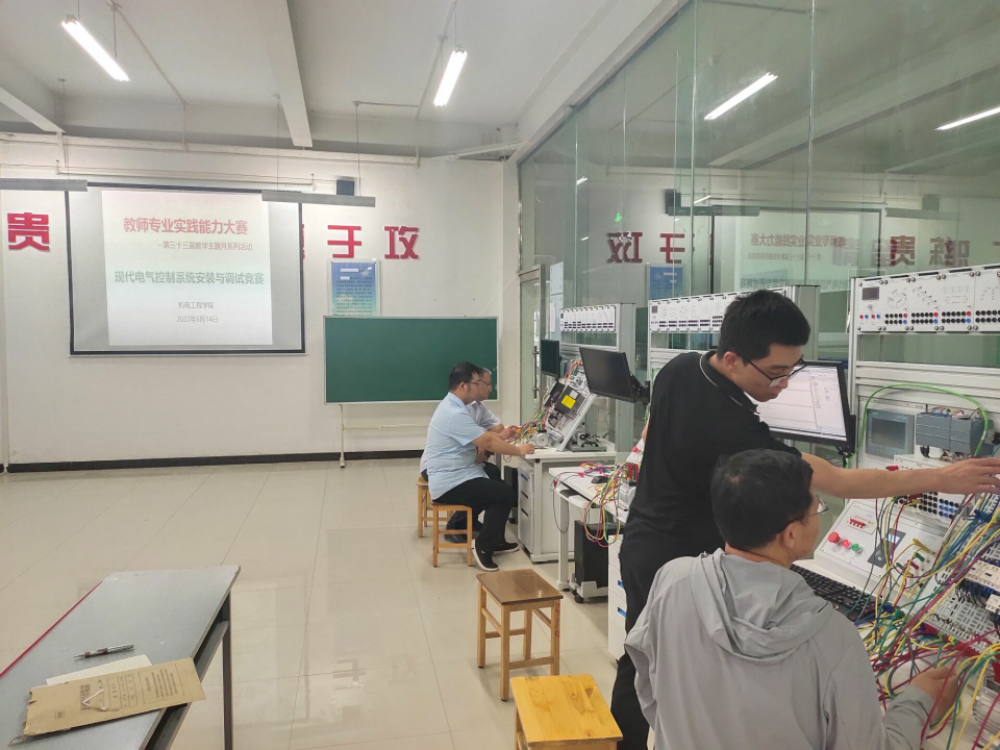 为提升教师的专业技能水平,展示教师精神风貌和职业素养,实现“以赛促学、以赛促教”,根据学校第三十三届教学主题活动月部署安排,6月14日下午,机电工程学院在工科实训楼208现代电气装置实训室成功承办“现代电气控制系统安装与调试”教师组校级技能大赛。本次竞赛共有16名老师参加了比赛,其中机电工程学院12名,新能源工程学院4名。
