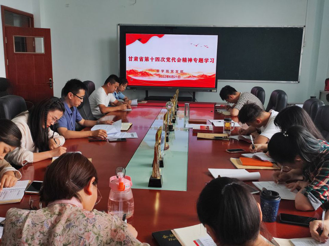 根据学校党委《关于认真学习宣传贯彻省十四次党代会精神的通知》要求,为深入学习贯彻甘肃省第十四次党员代表大会精神,全面准确把握其精神实质和核心要义,医学院于6月21日下午组织全体教职工学习甘肃省第十四次党代会精神,支部书记范玉敏主持会议。
