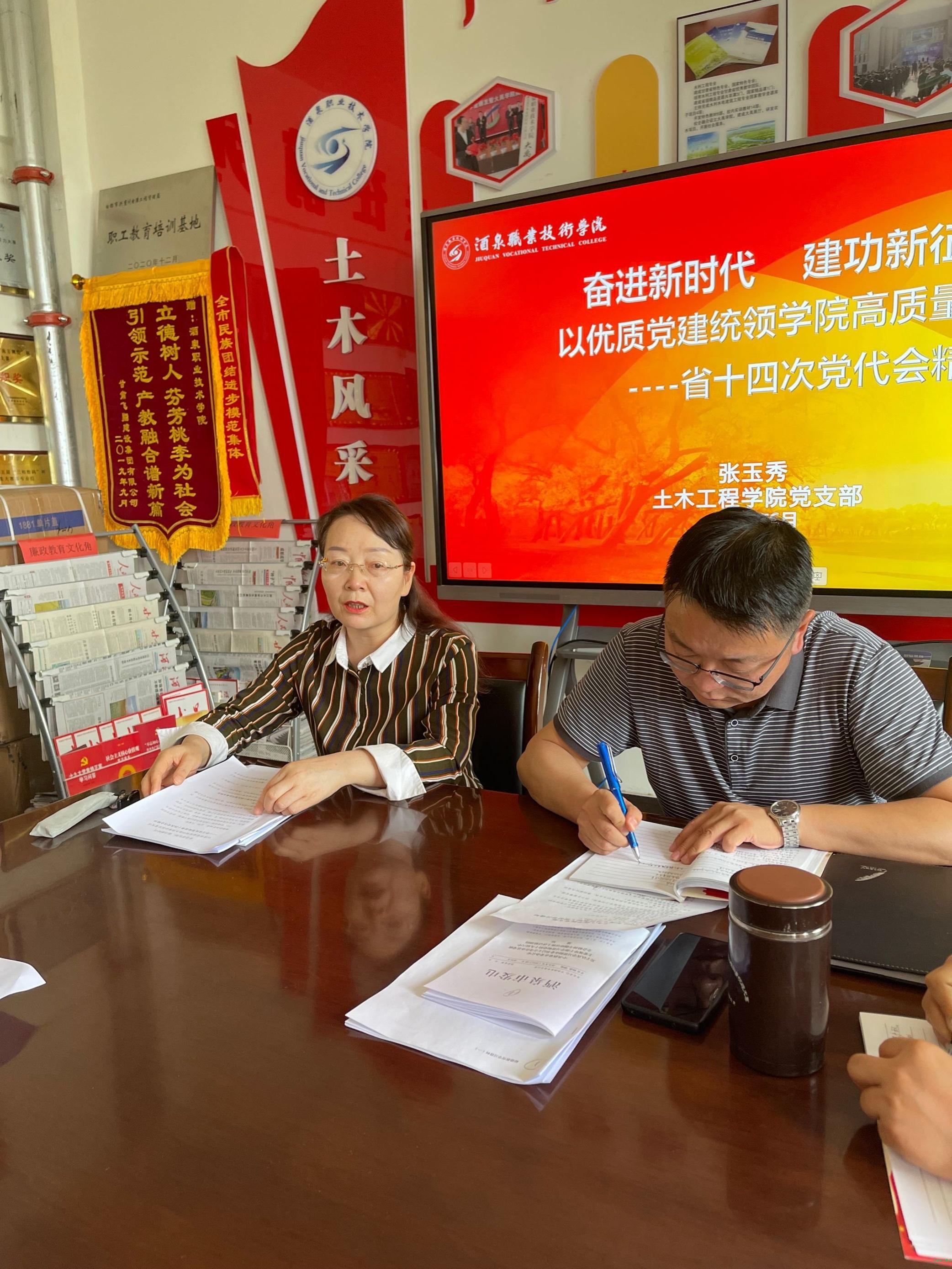 张玉秀同志的宣讲从甘肃省第十四次党代会基本情况、深入学习甘肃省第十四次党代会报告、学习第十四次党代会感悟与启发三个方面作为切入点,向全体教师传达了会议报告的主要内容,深入讲解了此次会议的主要精神内涵,,号召大家不断深入学习会议精神。并分享了亲身体验和感悟:“作为一名高职院校的教师代表,我将认真学习宣传贯彻本次党代会精神,始终牢记为党育人、为国育才的使命,认真落实立德树人根本任务,以“四有好老师”为标准,敬业奉献、创新进取,努力培养德智体美劳全面发展的高素质技术技能人才,为区域经济社会新发展和乡村振兴贡献自己的微薄力量。”