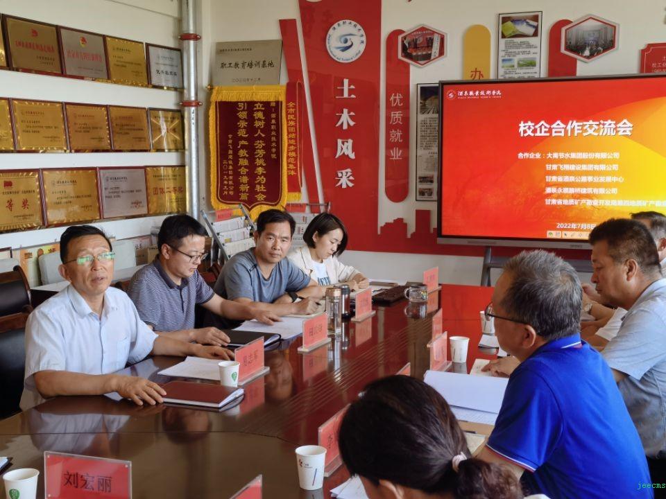 甘肃飞翔建设集团有限公司、大禹节水集团股份有限公司、甘肃省地矿局第四地质矿产勘查院、甘肃省酒泉公路事业发展中心、酒泉恒翔建设工程质量检测中心有限公司等5家企事业单位代表介绍了企业基本情况,以及校企双方在学生实习就业、员工培训等方面的合作基础情况,并提出了企业未来发展对技术技能人才的需求情况及校企共建水利与土木类专业合作意向。