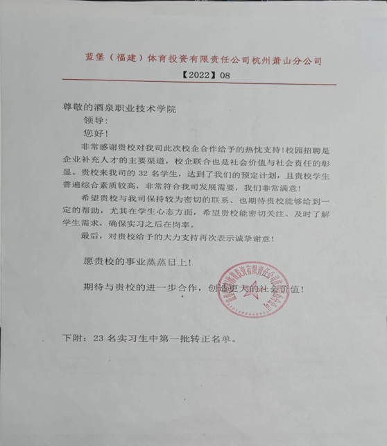 2022年8月28日,我院合作企业--浙江省杭州市蓝堡体育投资有限责任公司,对我院2020级健身指导与管理专业实习的23名学生进行了实习总结表彰。