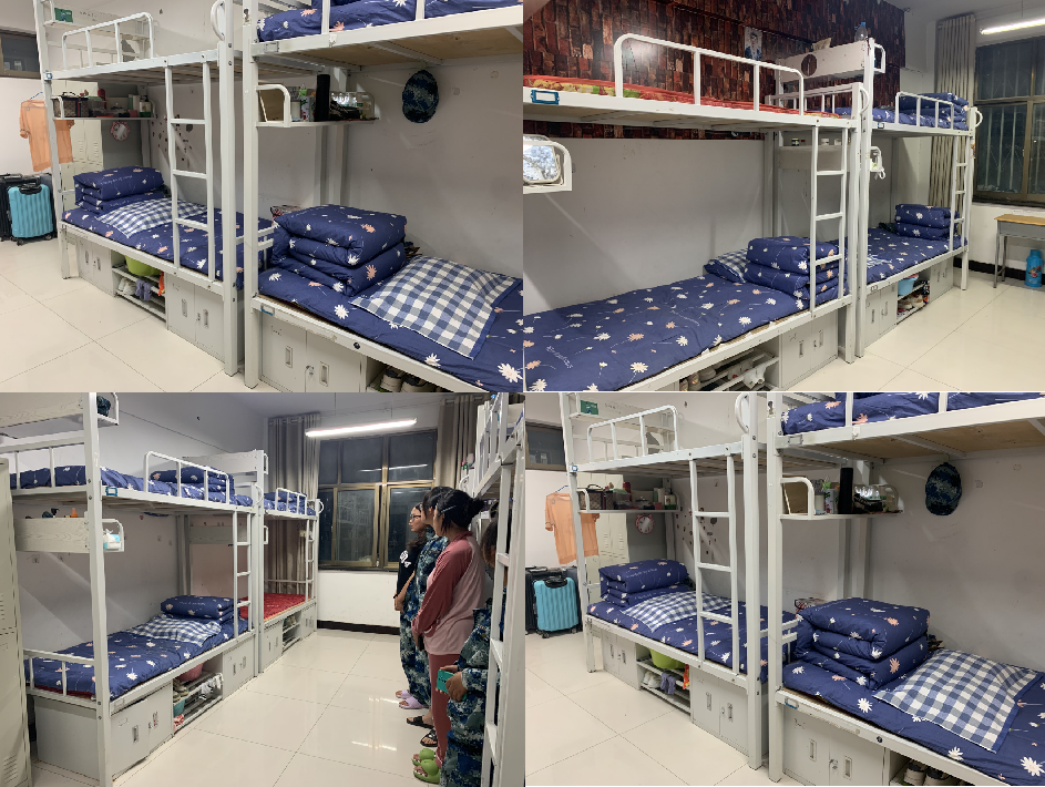 军训教官来在新生寝室,亲自示范如何叠被子、挂毛巾、摆放物品等操作,向学员讲述内务整理的技巧。对于军训标志性“豆腐块”被子的操作要领,同学们认真观察教官的示范动作,并反复练习。运用“压、折、挤、掏”等基本动作完成从棉被到“豆腐块”的进步。接着教官对卫生区洗漱用品的摆放提出整改要求,学员积极配合重新布置摆放。