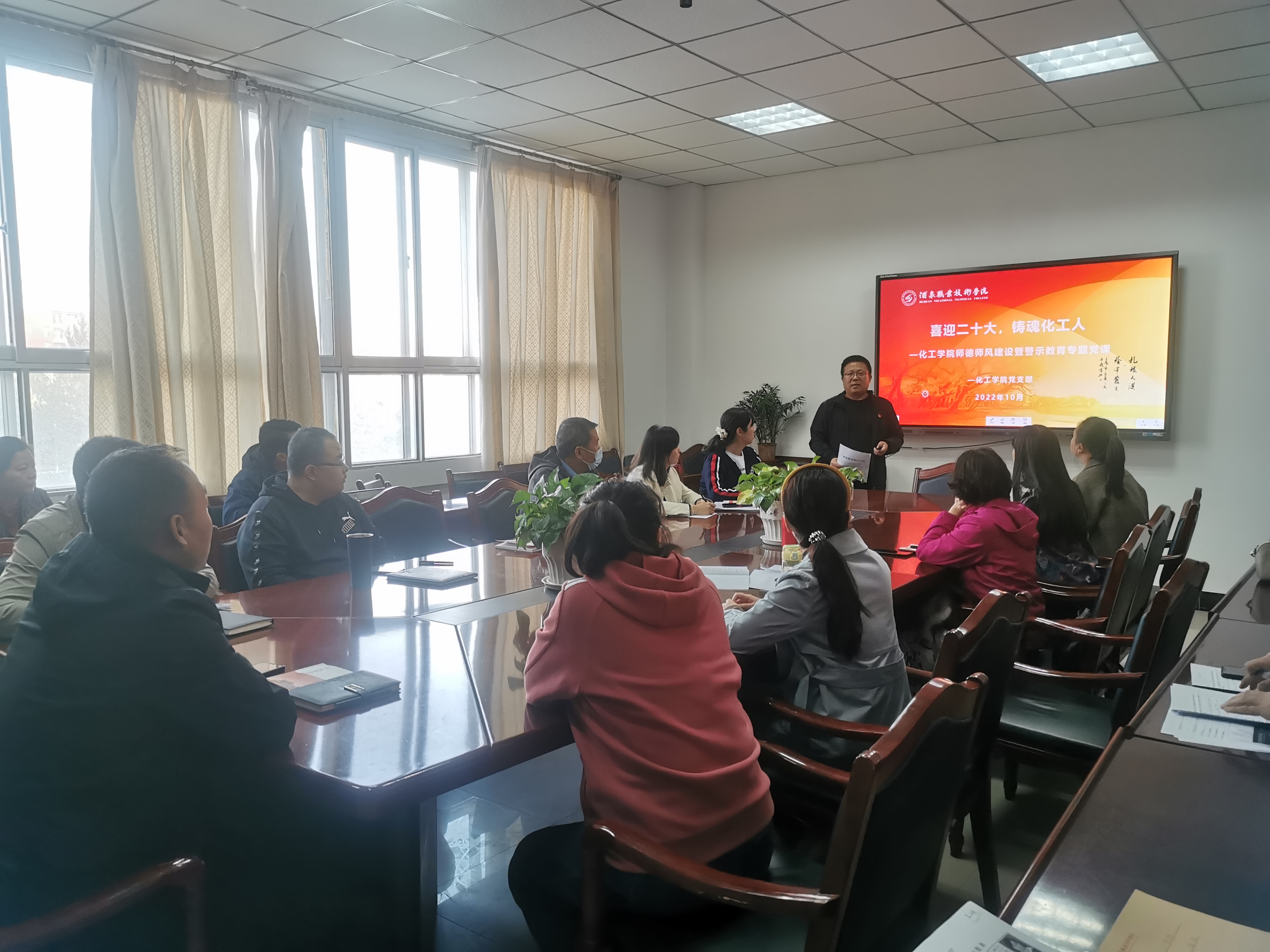 10月6日下午,化工学院在逸夫楼A213会议室开展主题为“喜迎二十大,铸魂化工人”的师德师风建设暨警示教育专题党课活动,党支部副书记孔祥波主讲,全院教师参会。