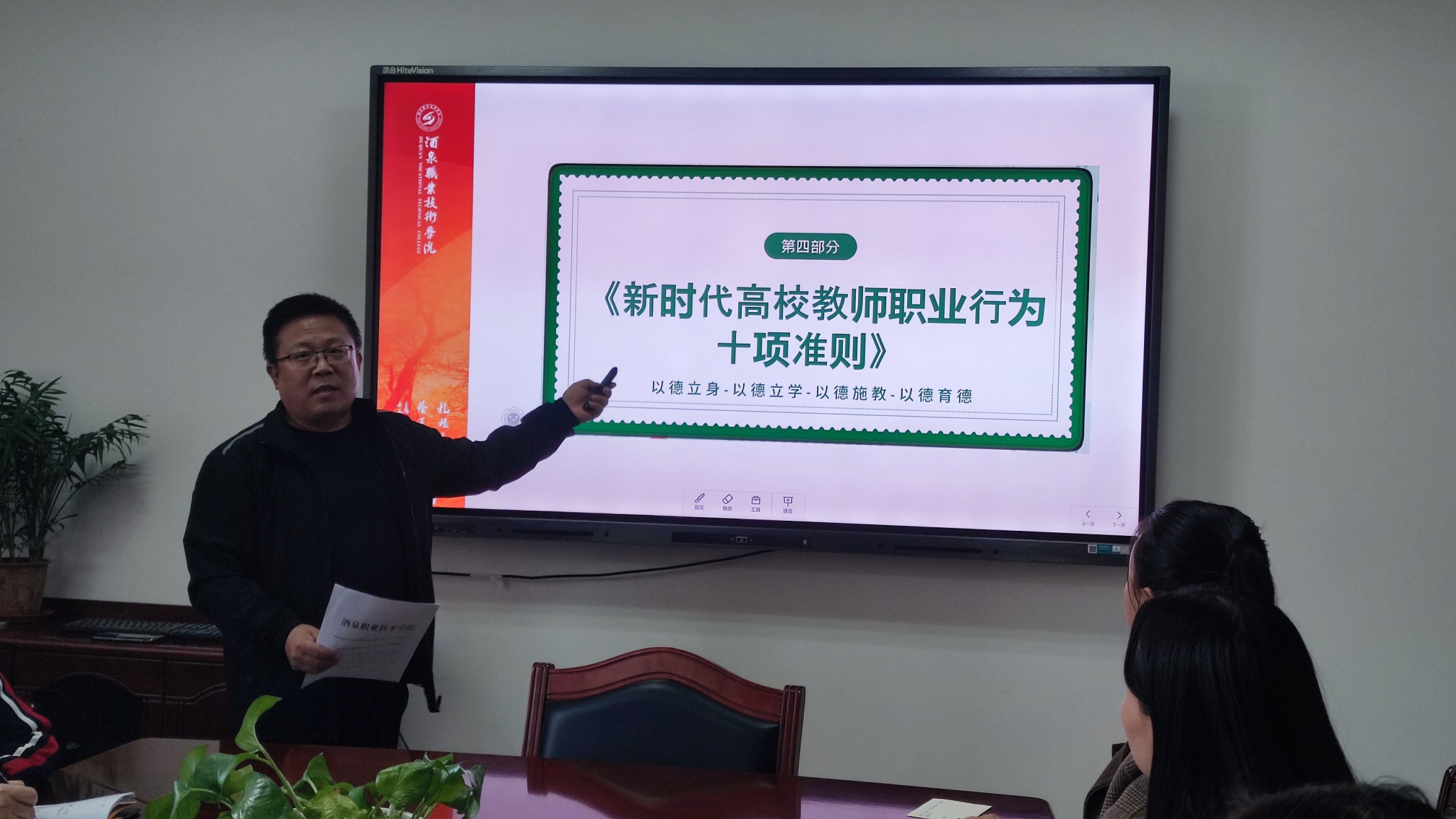 孔祥波从“学高为师,德高为范”出处及内涵引入,分别从新时代下的师德师风、违反师德师风的具体表现、违反师德师风的典型案例、《新时代高校教师职业行为十项准则》解读、做“四有”好老师 当育人大先生五个方面进行了讲解。重点分享了新时代师德师风的变化、教育部公开曝光第九批7起违反教师职业行为十项准则典型案例,带领老师们学习解读了《新时代高校教师职业行为十项准则》,提出了做“四有”好老师,当育人大先生的要求。