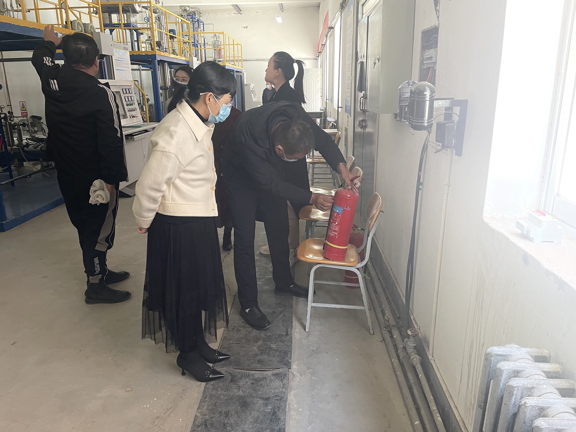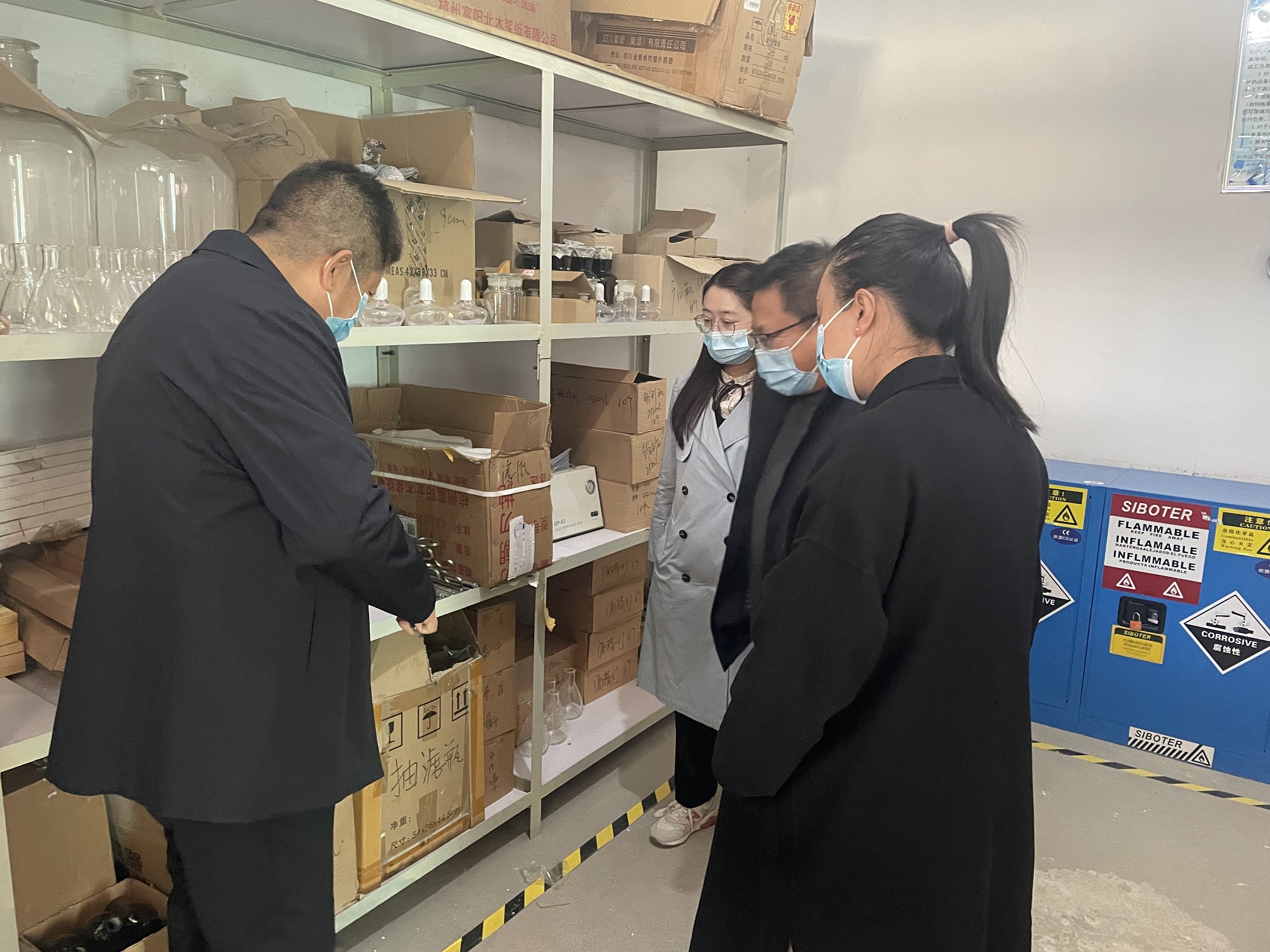白锦川一行首先到化工学院实验实训药品仓库进行检查,查看了化学品台账、消防设施、通风设施、监控和报警设施,重点对危险化学品管理、安全管理制度与操作规范的落实情况等进行了细致检查;接着一行人来到工科实训中心,依次进入每个实验室,对实验仪器设备、实验记录、实验安全措施等进行全面细致的检查。针对此次检查存在的安全隐患做好记录工作,并提出改进措施。