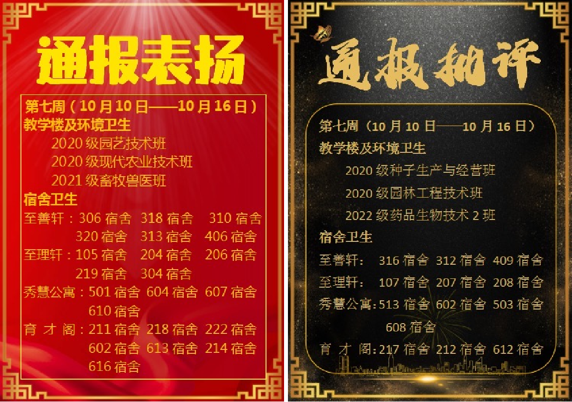 每天,生物工程学院学生会对各班学生的早操、早读、晚自习纪律、卫生(教室、宿舍、环境)等进行了有效的督促检查。每周公布一次,每周评选一次,并结合周评选的综合情况,进行一周一总结,一周一表彰,分别推出“红榜”和“黑榜”, 利用“红黑榜”制度,激励先进鞭策后进。