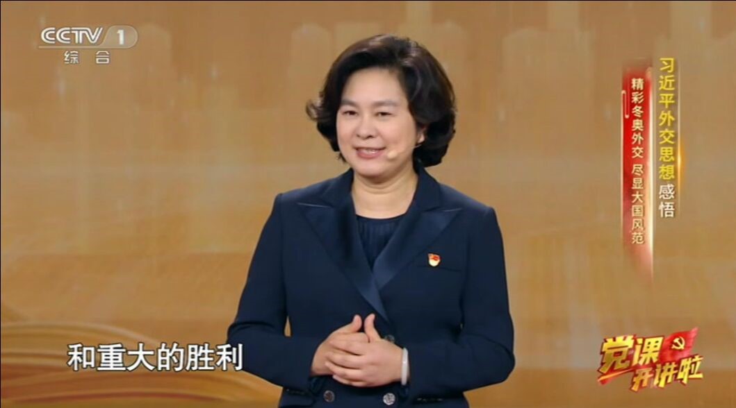 担任本次党课主讲人的是外交部党委委员、部长助理,外交部发言人华春莹,从“回答时代之问 彰显思想伟力”“植根人民情怀 心系天下大同”“精彩冬奥外交 尽显大国风范”三个方面,展现新时代中国特色大国外交风范。