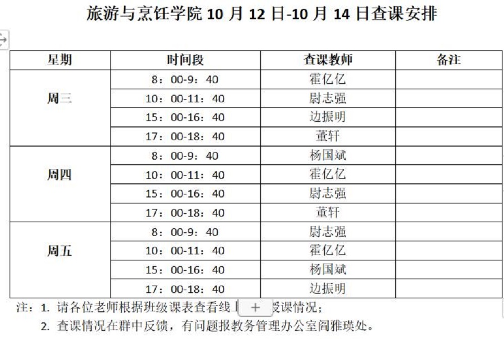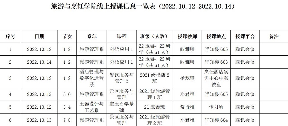 受疫情影响,自10月12日起,旅游与烹饪学院全面开启线上线下相结合的教学模式。旅游与烹饪学院严格遵守学校规章制度,在做好疫情防控的前提下,积极倡导未能到校的广大教师利用现代网络教育技术,创新教育教学方式,认真开展线上教学、积极组织线上互动、正确引导学生在线学习、完成作业,做好辅导答疑、测验考核等教学活动,有效保证线上教学质量,做到线上线下教学同质等效。