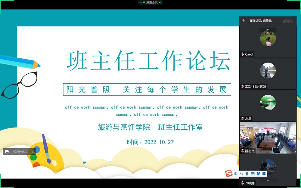 为进一步强化班主任管理责任意识,提高班级管理工作质量,保障学生身心健康发展,10月27日下午,旅游与烹饪学院杨蕊肇名班主任工作室全体成员参加了“提高班级管理水平,促进学生健康发展”班主任工作论坛,本次活动邀请2022年校级模范班主任董轩老师和张雪婷老师分享班级管理经验。活动由工作室主持人杨蕊肇主持。