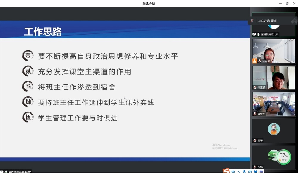 在认真听取了两位班主任老师的精彩分享后,工作室成员就“如何做好家校沟通”、“怎样拓展学生课余实践活动”展开讨论,大家一致认为,班主任应当充分尊重学生、了解学生自身特点,平等地对待认知特点不同、兴趣爱好不同、专业特长不同的学生,归纳学生之间局部的有限的相同性,特别是在疫情防控期间,利用线上线下平台,组织好各类文化、体育活动,关注学生的心理健康,使每一个学生都能健康的成长与发展,用理念引领班级文化建设,促进班级健康稳定发展。