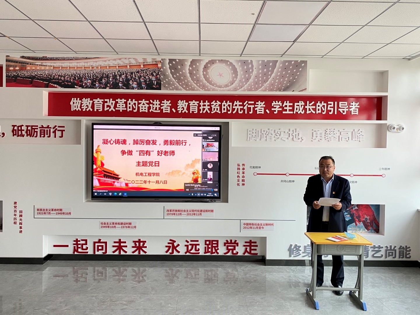 院系动态 > 正文为了深入学习宣传贯彻党的二十大精神,不断培养党员在新时代干事创业精神,践行党的初心使命,激励全体党员坚定理想信念,在教育教学工作中贡献自己的力量。11月8日下午,机电工程学院在格物楼二楼党建活动室开展了“凝心铸魂,踔厉奋发,勇毅前行,争做‘四有’好老师”主题党日活动。