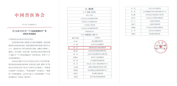 2022年11月15日,由中国兽医协会举办的“了不起的宠物医生”奖评选活动揭晓,该奖自去年12月启动,通过自主申报、执委会和组委会审核、评选及线上投票,最终评选出“临床杰出专科医生奖”15人,“最受宠主喜爱奖”5人,“终身成就奖”1人,“摇篮奖”5所院校,以及宠物医生“提名奖”87人。生物工程学院教师曹亮荣获中国兽医协会“了不起的宠物医生”提名奖。