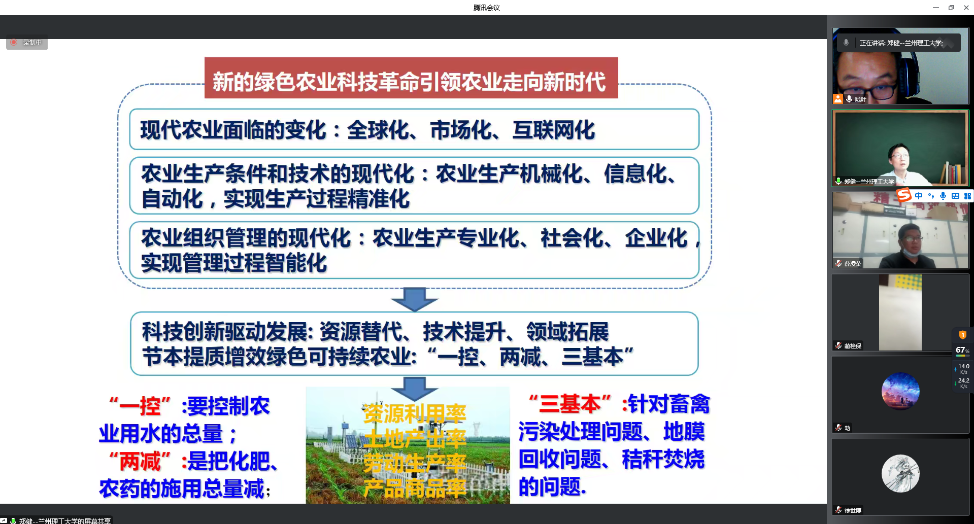 2022年11月25日,兰州理工大学博士生导师、教授,甘肃省生物质能与太阳能互补供能系统重点实验室副主任,国家自然科学基金同行评议专家,甘肃省科学技术奖励农业领域评审专家郑健,通过腾讯会议在线作了题为《依靠科技创新驱动促进农业绿色提质增效》的报告。土木工程学院学生及教师200余人参加了报告会,学院副院长蔺栓保同志主持报告会。
