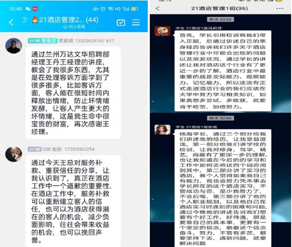 王品集团的孙云亮总经理讲授了《西餐礼仪及红酒品鉴》、敦煌华夏国际大酒店的孙海玲总经理分享了《择一事终一生—我的职业成长历程》、希岸酒店中宁县政府店总经理杨海分享了《酒店人职业生涯规划》、山东蓝海酒店集团人力资源总监杨兆永分享了《酒店集团中如何做好人员激励》、兰州万达文华酒店招聘部经理王丹分享了《服务补救-重获信任》、兰州凯悦酒店的招聘部经理许婉勤分享了《市场细分与酒店人才必备的能力与素养》、敦煌东驿酒店人事部经理杨莉分享了《融入地方文化的度假型酒店》。讲座结束后,同学们对酒店业的发展和前景有了更加充分的了解,对自己的未来职业规划也更加清晰,坚定了自己从事酒店行业的信心。同学们纷纷表示要秉承我校“修身笃学·精艺尚能”的校训,扎实学好专业知识,提高专业技能,顺利走上工作岗位。