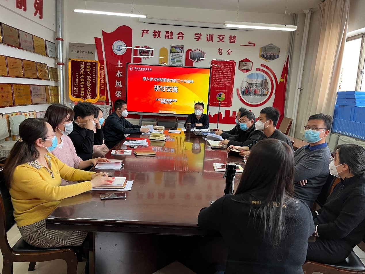 为深入学习贯彻党的二十大精神,进一步深化认识、鼓舞干劲,12月14日,土木工程学院在前期党小组研讨交流的基础上,组织开展党的二十大精神专题学习研讨交流活动,会议由党支部书记、院长田政锋同志主持,全体教师参加。