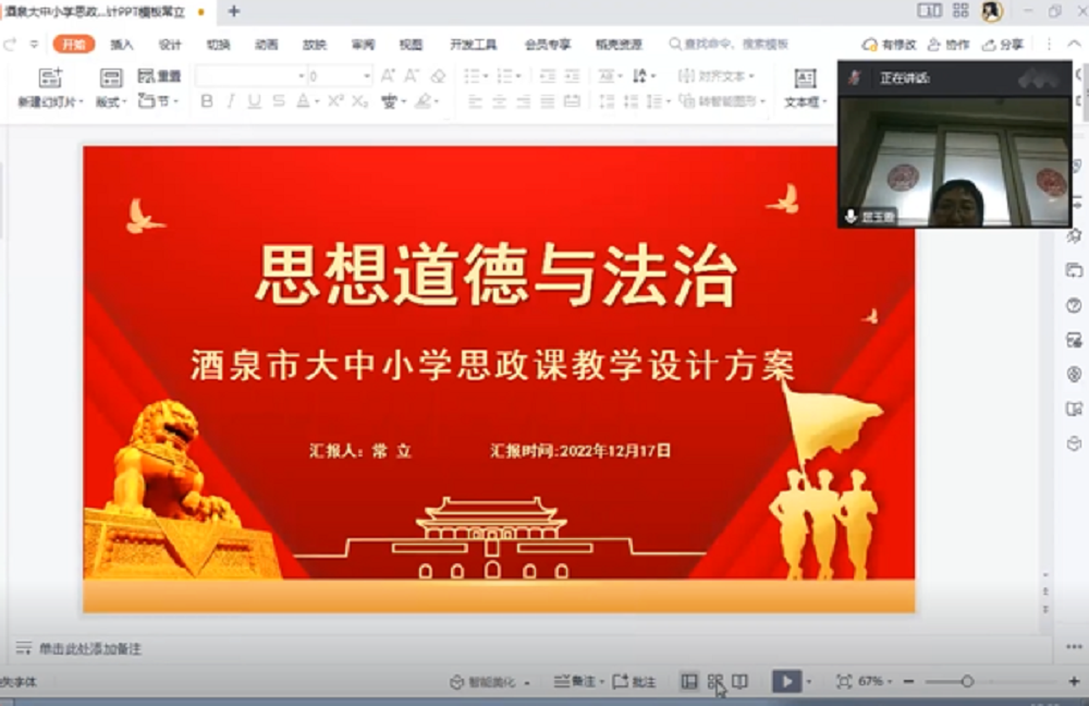 酒泉农垦技工学校(甘肃广播电视大学农垦河西分校)常立老师结合《思想道德与法治》课进行教学设计展示,从教案设计,教学活动对于融入二十大会议主题的重要作用进行了详细的讲解。