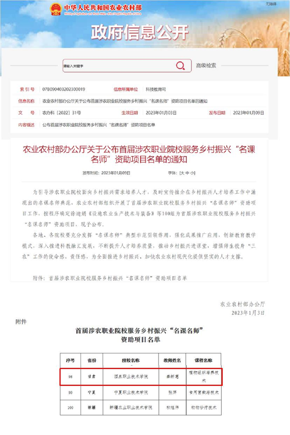 近日,农业农村部办公厅下发了《关于公布首届涉农职业院校服务乡村振兴“名课名师”资助项目名单的通知》,全国共有100组课程获评首届涉农职业院校服务乡村振兴“名课名师”资助项目。我校生物工程学院秦新惠教授负责的《植物组织培养技术》课程经学校推荐、甘肃省农业农村厅评选,成功入选农业农村部首届涉农职业院校服务乡村振兴“名课名师”资助项目,这是甘肃高校唯一入选的一组课程,也是我校服务乡村振兴人才培养工作的重要突破。