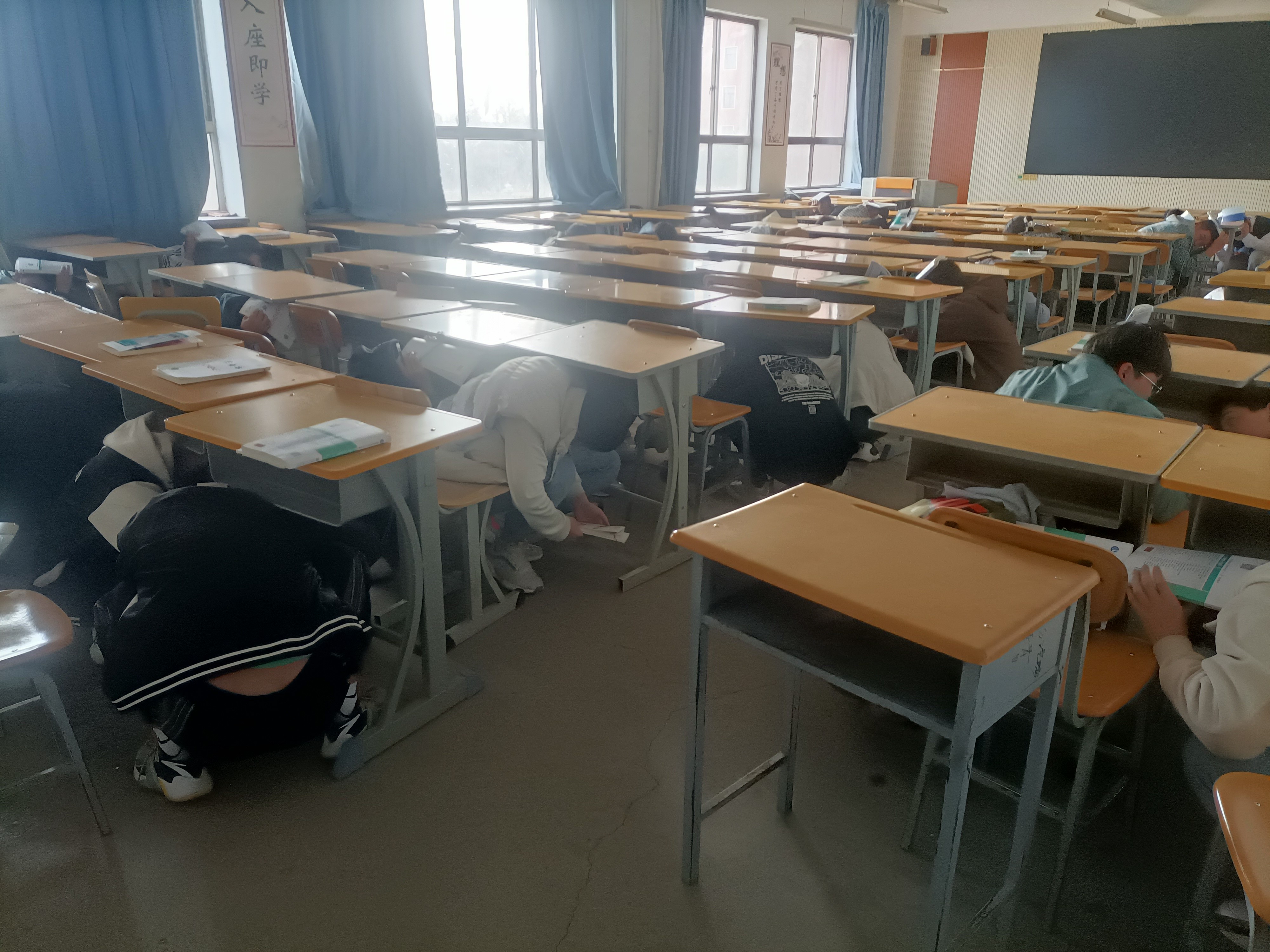 演练前,学院制定了详细的演练方案并以班级为单位认真组织学习防震减灾知识。下午17时,随着行知楼内演练信号的响起,演练正式拉开序幕。各班主任指挥学生迅速抱头,尽量蜷曲身体,降低身体重心,就近躲避在课桌下或承重墙的墙根、墙角等有安全遮挡物体的下方进行避震环节演练。当第二次信号响起时,教学楼1-3层的同学迅速、有秩序地抱头弯腰撤离教室,按照预设的撤离路线迅速有序地撤离到行知楼前侧广场。各班及时清点人数,上报指挥部。
