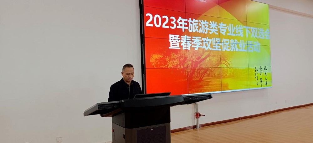 为了深入贯彻党的二十大精神和甘肃省“三抓三促”会议精神,更好地服务大敦煌文化旅游经济圈的建设,搭建用人单位与毕业生沟通的桥梁与纽带,拓宽毕业生就业市场,实现毕业生与用人单位双向选择、互利共赢,促进高校毕业生充分高质量就业,3月14日,酒泉职业技术学院旅游与烹饪学院举办了“旅游类专业2023年校园双选会暨春季攻坚促就业”招聘活动。旅游与烹饪学院副院长王晓梅主持,学校党委委员、副校长王立智出席,招生就业处副处长张晓彬及旅游与烹饪学院全体师生参加。