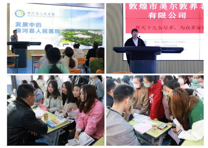 精河县人民医院、金塔县人民医院等12家企事业单位参加现场招聘。宣讲会上,各参会单位通过视频、PPT等多种方式进行就业宣讲。宣讲会后参会学生根据自己意愿向心仪单位投递简历,现场气氛有序热烈,累计达成80余人与用人单位达成就业意向。