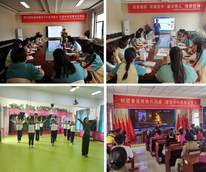 舒志华教授以《幼儿教师教学语言修养》为主题,给阿克塞幼儿园教师带来了一场妙趣横生,精彩绝伦的讲座,强化教师的国家通用语言文字意识,提升少数民族教师使用国家通用语言文字教育教学能力。高立武老师针对教师的规范书写进行了指导,讲授了幼儿美术教育基本理论和教学活动的组织与实施,提高了教师对于常用书法的临习技能和创作实践能力。程姝玮老师针对舞蹈专业能力及教学水平进行了示范讲解,帮助幼儿教师掌握了一定的舞蹈基本知识和技能,提升了教师的舞蹈教学能力与幼儿舞蹈创编能力。田琨老师深入少数民族乡镇社区,开展了国家语言文字法规政策宣传活动及农牧民普通话培训,支持、指导帮扶了农村乡镇开展“普通话+职业技能”培训。