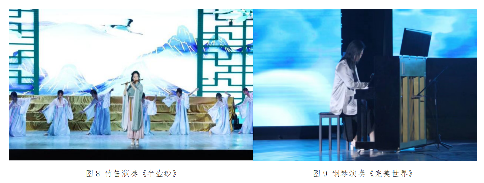 《青玉案·元夕》是由蒋文娟老师钢琴伴奏,于芳老师弹奏古筝,王婷老师、段晓燕老师共同演唱的曲目,钢琴声清脆响亮,古筝声抑扬顿挫,女声音色优柔飘渺,三种声音和谐地交织在一起,流入观众的心里。