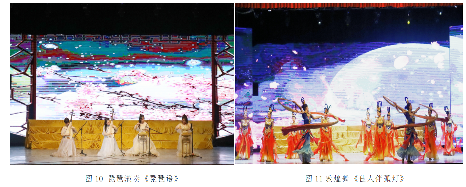 郭真老师清澈明净的琴声潺潺流动,让听众沉浸在“完美世界”中。由殷蓉、张璐、李思语、康雅菲四位老师合奏的曲目《琵琶语》如泣如诉,将听众带入一种缠绵悱恻、欲说还休的境界。琵琶伴奏的敦煌舞《佳人伴孤灯》,呈现了美轮美奂、气势恢宏的敦煌盛景。