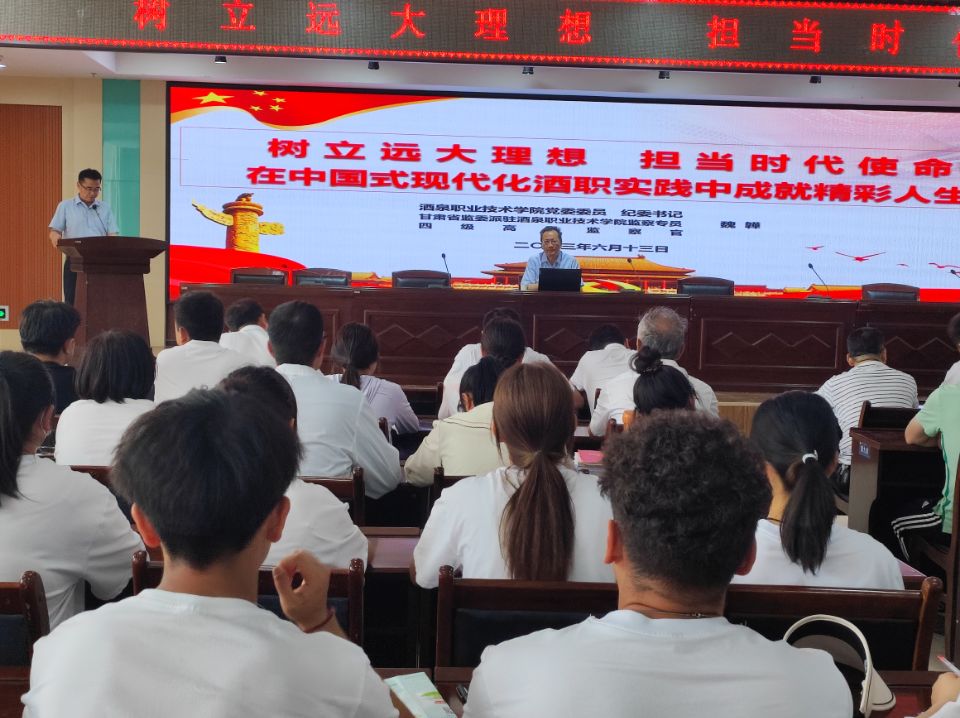 6月13日下午,酒泉职业技术学院党委委员、纪委书记、甘肃省监委派驻酒泉职业技术学院监察专员、魏韡同志给医学院、体育与健康学院全体教职工、发展对象、入党积极分子、团学干部、部分团员代表共200多人讲了一堂生动的专题讲座,魏韡书记围绕“树立远大理想、担当时代使命,在中国式现代化酒职实践中成就精彩人生”为主题展开讲座。