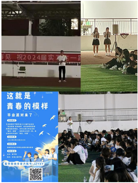 俗话说"远亲不如近邻",为了活跃端午节前节日气氛、缓解同学们期末考试前学习压力,同时为了欢送医学院以及机电工程学院2024届学生结束校园生活、前往实习岗位实习工作,契合学工部推进的“走出宿舍、走向操场”号召,活跃宿舍文化建设。6月20日晚,医学院和机电工程学院2021级1000多名学生在新体育场举办了“草坪演唱会”。