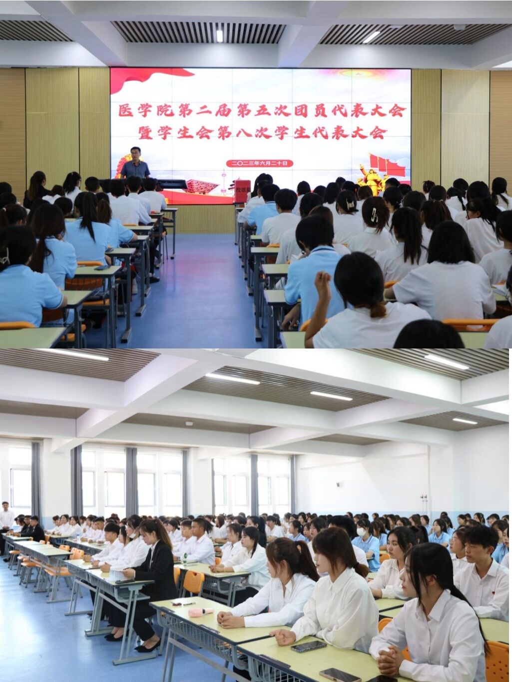 为深入学习贯彻习近平新时代中国特色社会主义思想,进一步加强党对团组织的领导,推动团学工作的高质量发展,逐步提升团学干部的服务质量,2023年6月20日下午17:00,于弘远楼A506教室,举行医学院第二届第五次团员代表大会暨第八次学生代表大会。医学院党支部书记、院长范玉敏、医学院党支部副书记段国萍、部分老师、各级团学干部代表及各班学生代表出席此次会议。