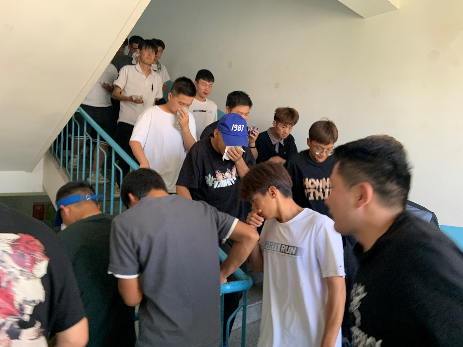 下午17:10信号发送组负责老师用喇叭通知:“消防应急疏散演练开始,大家快速疏散”,并用哨声发出警示,所有学生开始疏散。疏散引导老师立即组织学生迅速按紧急预案的疏散线路拿起湿毛巾,捂住口鼻,弯腰小步快走,迅速且有序下楼。紧急救护组老师立即携带医疗救护箱前往疏散地应对可能发生的意外事故。经过10分钟左右的时间至美轩6层楼共计512名学生全部疏散到至美轩西侧篮球场。
