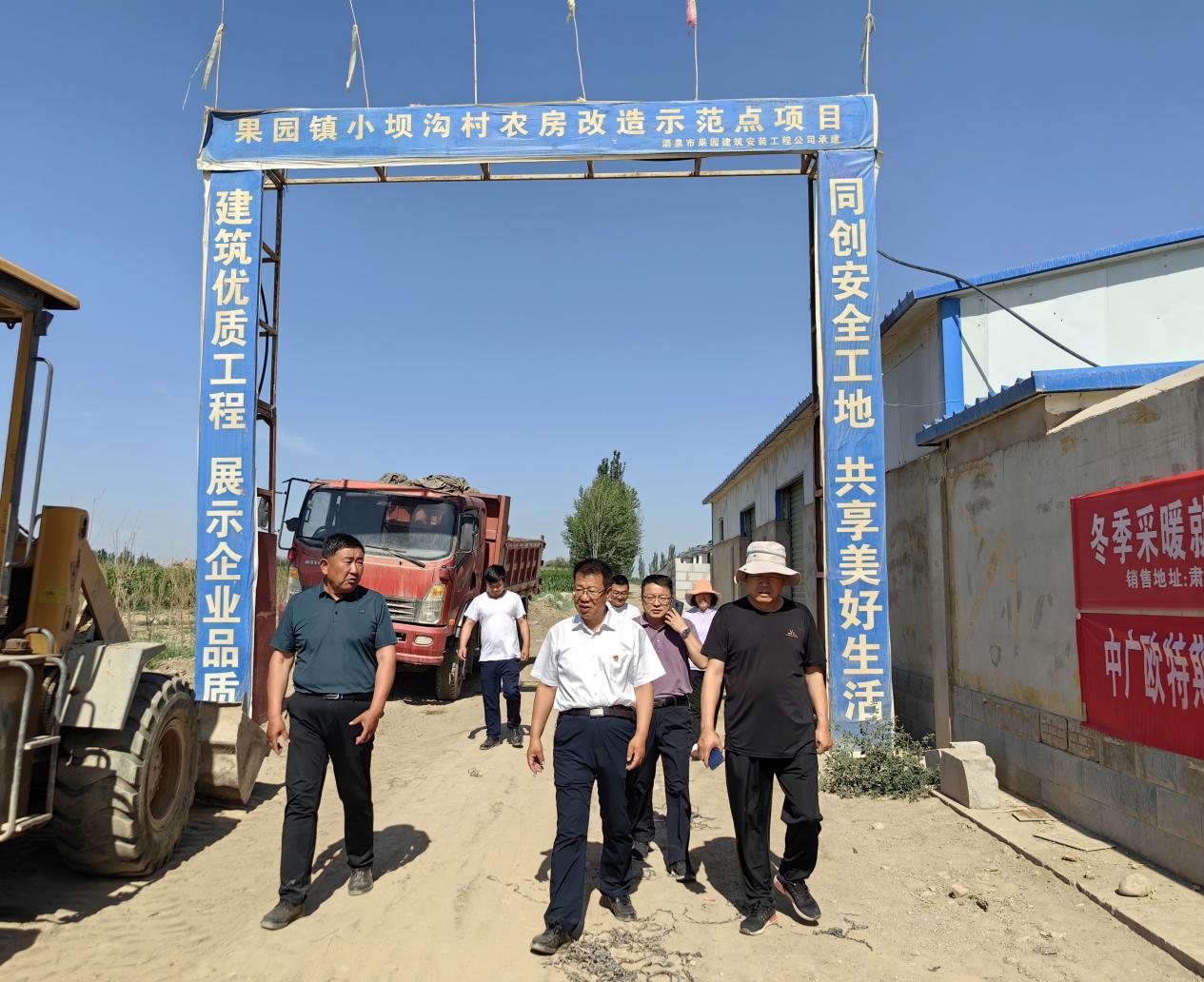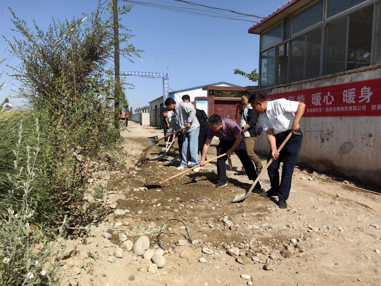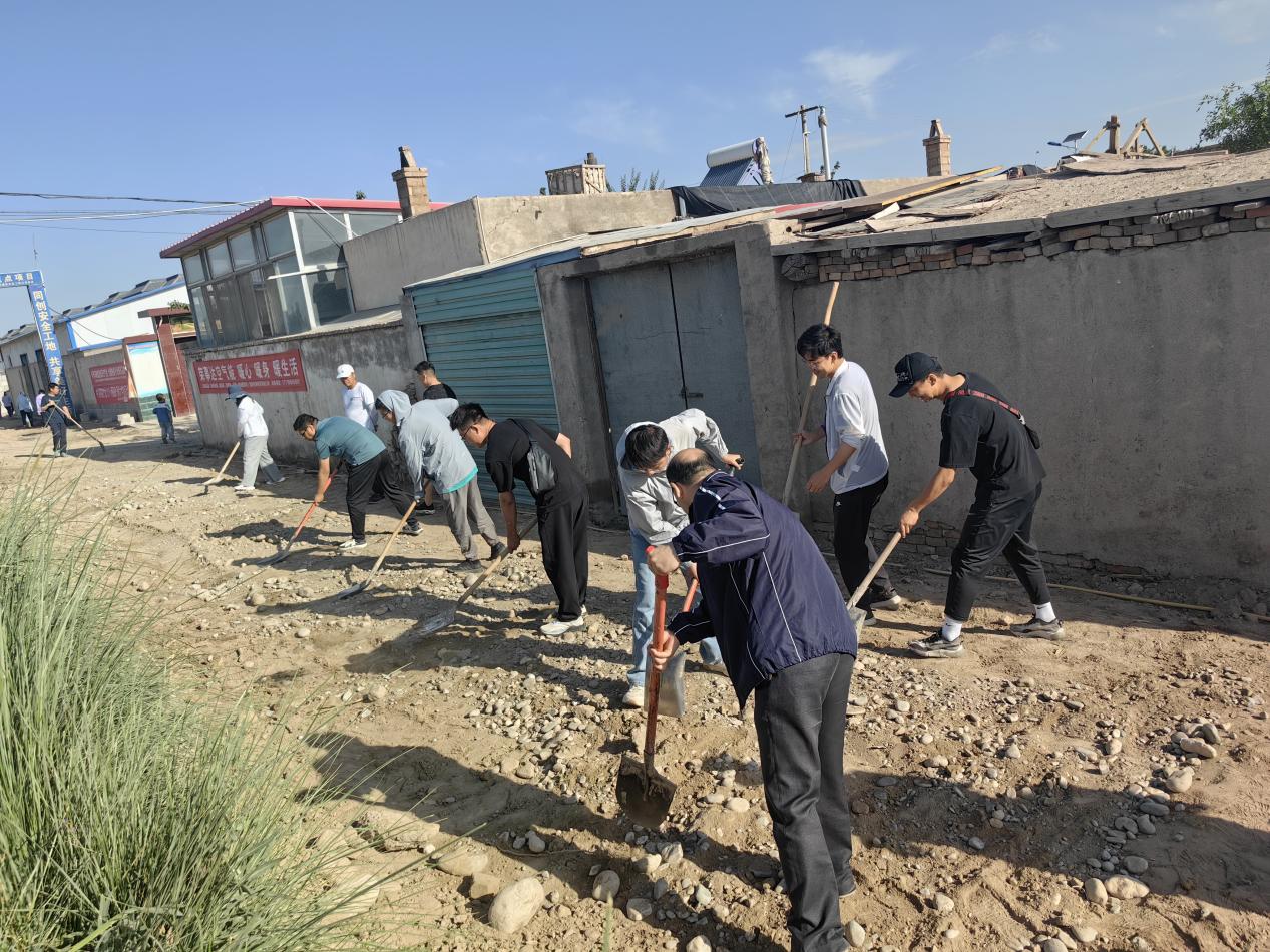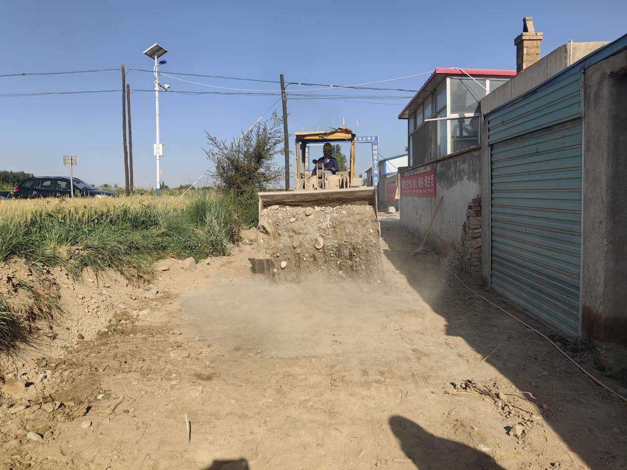 上午八时许,在学校校党委委员、副校长王金明同志的的带领下,土木工程学院全体教师积极行动,会同果园镇小坝沟村委会相关领导,共同前往施工现场修筑田间作业道路,并协调铲车等机械拉运沙石铺筑路面。烈日炎炎、骄阳似火,老师们丝毫没有半分畏惧,不顾炎热与疲劳,马不停蹄地埋头苦干,呈现出一派繁忙的建设景象。