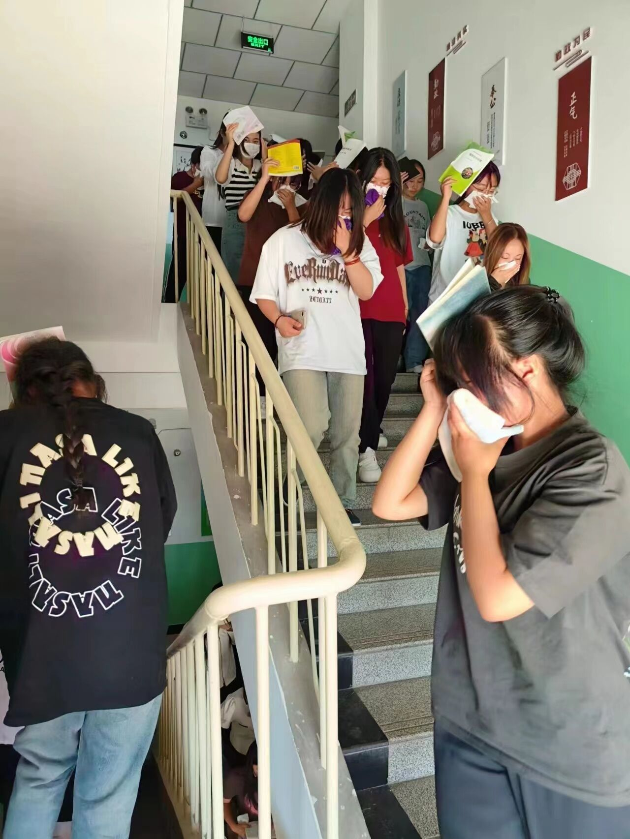 随着消防警报铃声的响起,演练正式开始。大家弯腰,用湿巾或毛巾捂着鼻子,迅速有序地离开教室,并沿着预定的疏散路线快速、有序撤离到了安全地带,整个过程做到井然秩序、行动快速、配合默契。