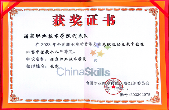 院系动态 > 正文9月1日至9月3日,“中银杯”全国职业院校技能大赛(高职组)幼儿教育技能赛项(教师赛)在黑龙江幼儿师范高等专科学校举行。酒泉职业技术学院教师袁霓代表甘肃省参赛,凭借过硬的专业素养、理论基础和顽强拼搏的精神,经过激烈的角逐斩获全国三等奖,实现了我校幼儿教育技能赛项国赛教师组项目上的历史性突破。